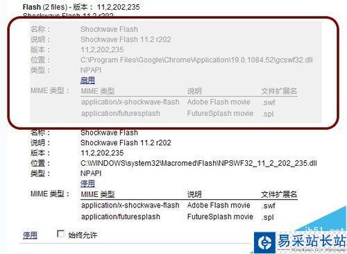 1、如果在plugins中,看到多個Flash版本。這在舊版本的Google Chrome瀏覽器中,會有這種情況。