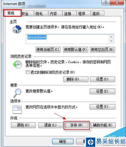 2、打開IE選項之后,找到 常規(guī)----字體 功能,如下圖