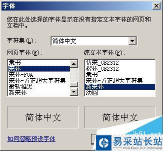 3、出現(xiàn)的字體對話框中,IE瀏覽器默認的字體格式是宋體和新宋體(網(wǎng)頁字體HTML和純文本)
