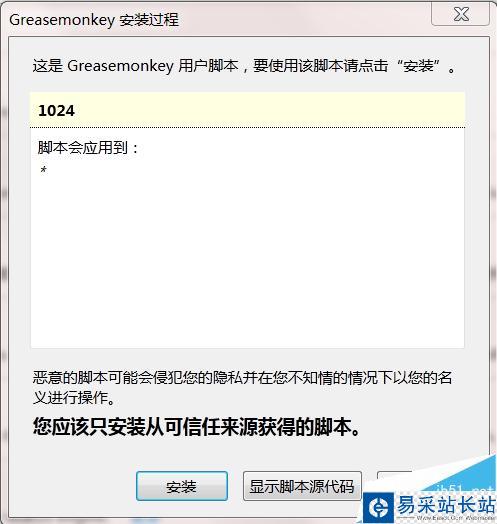 4、然后把剛才的1024.user.js用鼠標直接拖動到火狐上,就會提示安裝腳本,點安裝