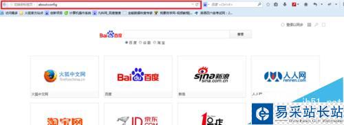 1、首先打開火狐瀏覽器的首頁,在地址欄輸入”about:config“并回車。