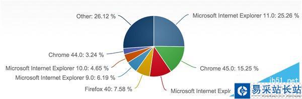 具體到瀏覽器版本,IE11瀏覽器以25.26%的份額位居第一位(8月份數據26.9%),Chrome 45以15.25%的市場份額位居第二。IE8以11.71%的份額排名第三(8月份為10.92%,下降明顯)。Firefox 40從9月份開始,以7.58%的市場份額排行第四。