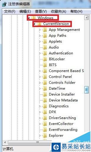 4、向下拉動滾動條找到并依次打開Windows/CurrentVersion