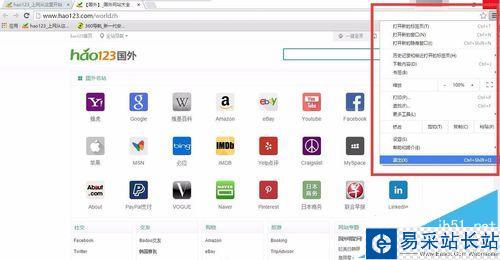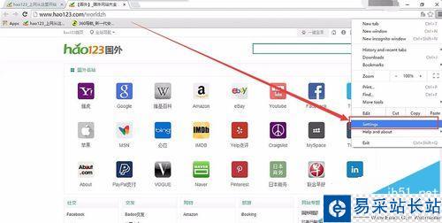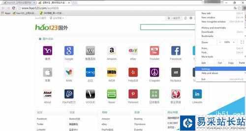 2、這是巨頭打開谷歌瀏覽器后的首頁。抱歉可能跟你的首頁不太一樣。點擊右上角的編輯菜單,彈出的菜單欄都是英語版的。選擇“Settings”