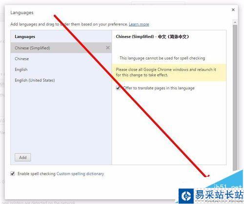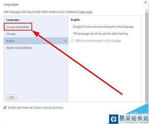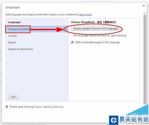 5、在語言設(shè)置頁面,選擇“Chinese(Simplified)”(注意一定要選擇這個,不要選擇別的),選中后,點擊右側(cè)“Display Google Chrome in this language”