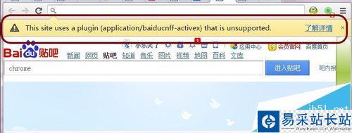 1、如果你用Chrome瀏覽器打開百度貼吧,可以發(fā)現(xiàn)上方出現(xiàn)一個提示:此網(wǎng)站所用的插件application/baiducnff-acticvex不受支持