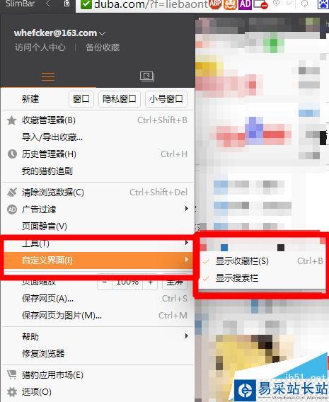 2、一般不論什么皮膚,在左上角都是一個設置的快捷菜單,打開找到【自定義界面】→【顯示搜索欄】前面的勾去掉就可以了