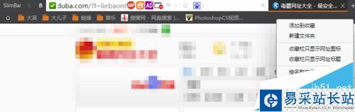 4、對于收藏欄可以通過3種辦法隱藏,第一個辦法就是上面提到的在快捷設置菜單里有,第二個辦法就是在收藏欄的空白處點擊鼠標右鍵,可以具體對收藏欄進行設置整理和隱藏,如圖