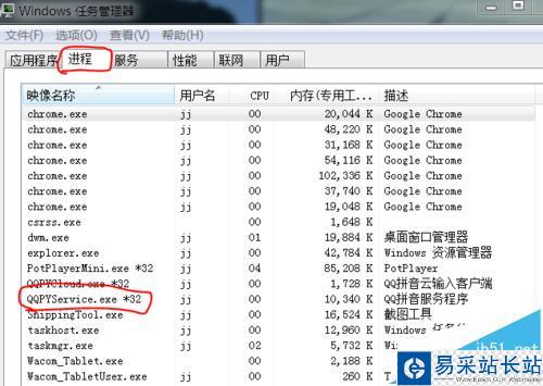 2、在任務管理器中切換到“進程”界面,在進程列表中找到"QQPYService.exe"進程。