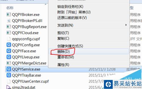 4、來到程序目錄,找到QQPYService.exe文件,右鍵點擊它,選擇 刪除。