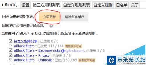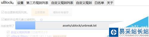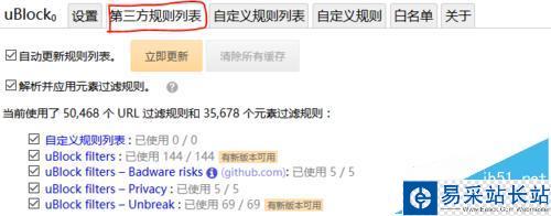 4、進入uBlock設置后,點擊“第三方規則列表”