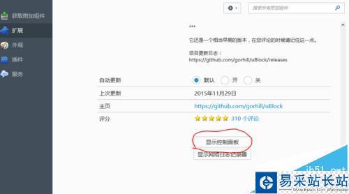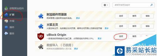 2、Firefox進入設置的方法:點擊菜單-附加組件-擴展-uBlock 選項-顯示控制面板。