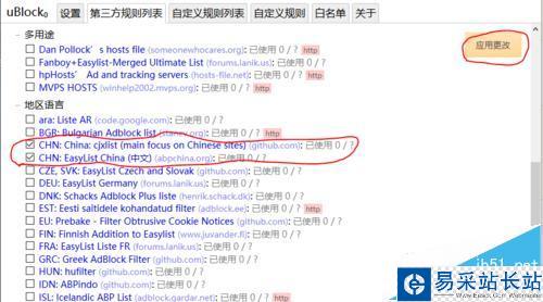 5、在第三方規則列表中,往下滾動列表找到“地區語言”,在地區語言下面有兩項"CHN"開頭的條目,給他們打上勾,然后點擊“應用更改”保存。