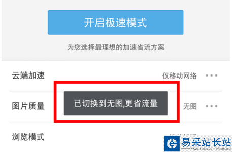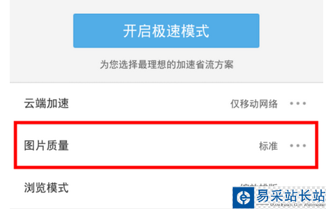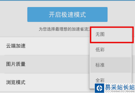 進入極速省流頁面之后,點擊“圖片質量”選項,然后將圖片質量設置為“無圖”。