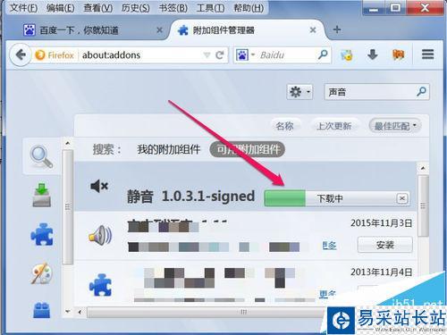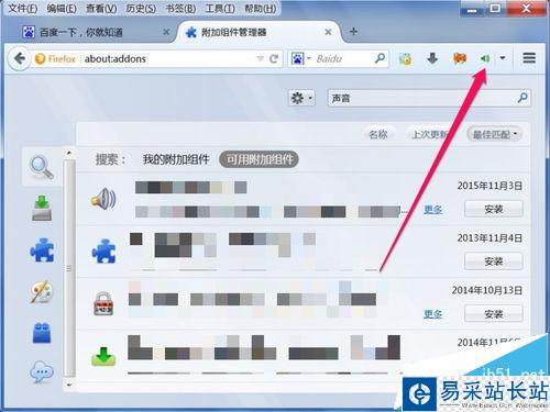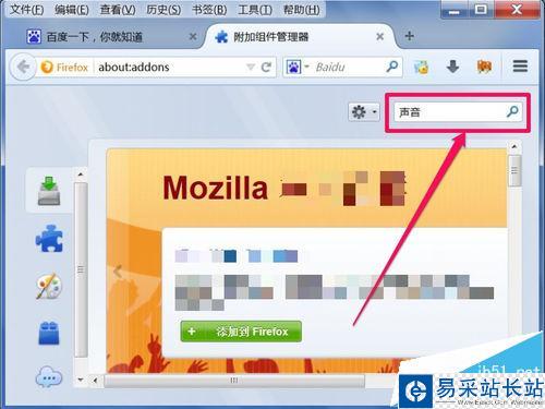 3、進(jìn)入附加組件管理器窗口,在搜索框中,輸入“聲音”二字,然后點(diǎn)搜索圖標(biāo)。