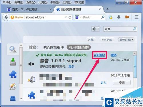 6、安裝完成后,需要重啟火狐瀏覽器,才能生效,按“立即重啟”按鈕即可。