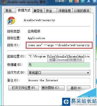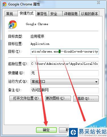 3、在目標路徑的后面添加【 --disable-web-security】,格式如下:C:/Users/Administrator/AppData/Local/Google/Chrome/Application/chrome.exe --disable-web-security,其中chrome.exe與--disable之間有一個空格