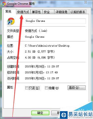 2、打開屬性窗口,切換到快捷方式選項卡下面,默認是常規選項卡。