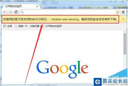 6、關閉瀏覽器重新通過桌面快捷方式的形式打開瀏覽器,瀏覽器提示"您使用的是不受支持的命令行標記: --disable-web-security。穩定性和安全性會有所下降",說明設置成功。