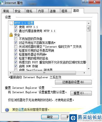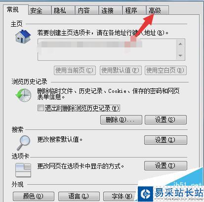 2、進(jìn)入internet屬性界面之后,我們?cè)谏戏降牟藛螜谥姓业礁呒?jí)選項(xiàng),點(diǎn)擊進(jìn)入高級(jí)界面。