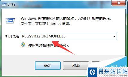 2、進(jìn)入運(yùn)行對(duì)話(huà)框,在文本框里面輸入入REGSVR32 URLMON.DLL命令,點(diǎn)擊下面的確定按鈕,然后重啟電腦系統(tǒng)。