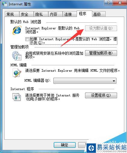 4、在上方菜單欄中找到程序選項(xiàng)點(diǎn)擊進(jìn)入程序界面。在默認(rèn)的web瀏覽器界面,點(diǎn)擊后方的設(shè)置默認(rèn)值。然后點(diǎn)擊確定此時(shí)我們的問(wèn)題已經(jīng)解決了。