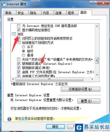 3、進(jìn)入高級(jí)屬性界面,我們?cè)谠O(shè)置欄里找到瀏覽選項(xiàng)里面的禁用腳本調(diào)試選項(xiàng),我們?cè)谇懊娲蚬础?/p>