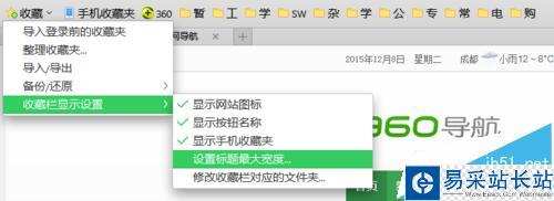 1、鼠標(biāo)點(diǎn)擊360安全瀏覽器工具欄中最左邊的按鈕“收藏夾”下拉菜單,選擇“收藏欄顯示設(shè)置”->“設(shè)置標(biāo)題最大寬度”。