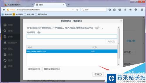 7、然后單擊“允許”,網(wǎng)址就會顯示在站點列表中。