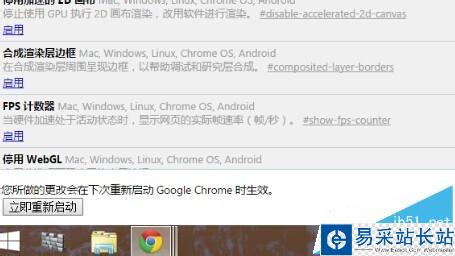 5、成功啟用后下方會有您所做的更改會在下次重新啟動Google Chrome時生效,如果當前你想立刻重啟chrome瀏覽器可點擊立即重新啟動,或下次手動打開Chrome瀏覽器