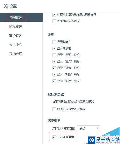 3、進(jìn)入設(shè)置頁面后,選擇“常規(guī)設(shè)置”后。在右邊頁面里,把“搜索引擎”項(xiàng)目下的“開啟即時(shí)搜索”選項(xiàng)取消勾選,就可以關(guān)掉咯(*^__^*)