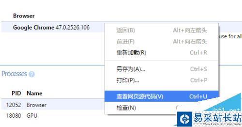 6、我們在此頁面上的瀏覽器進程上右擊鼠標,還可以查看打開網(wǎng)頁的源代碼。