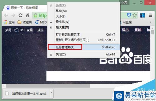 2、在Chrome瀏覽器的標題欄空白處右擊鼠標,再在彈出的菜單中選擇“任務管理器”。