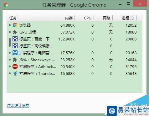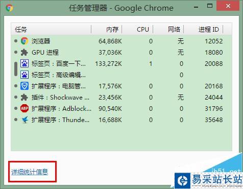 注意事項:在Chrome瀏覽器上打開的任務管理器不同于系統(tǒng)的任務管理器,只統(tǒng)計和Chrome有關的信息。