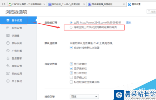 3.在【瀏覽器選項】界面下,點擊選擇【基本設置】--【繼續(xù)瀏覽上次關閉瀏覽器時在看的網頁】選項完成設置。(如圖所示)