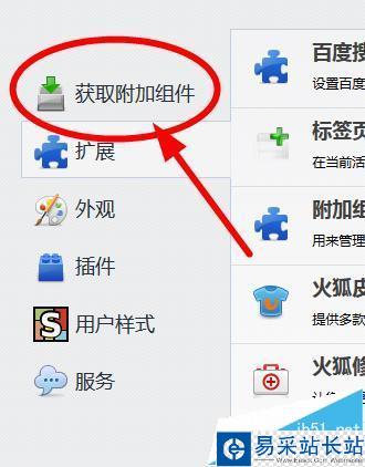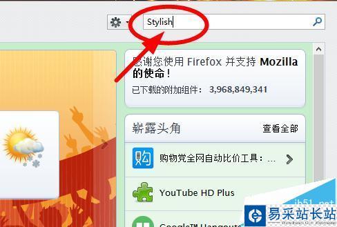 2、點(diǎn)擊獲取附加組件,并在出現(xiàn)的網(wǎng)頁的搜索欄中輸入Stylish,并搜索