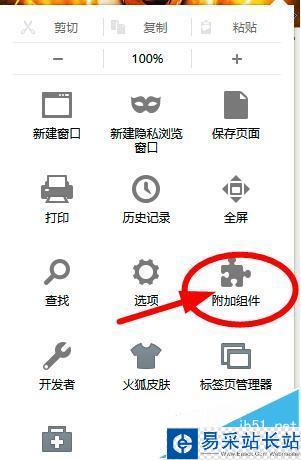 1、點(diǎn)擊瀏覽器右上方的打開菜單,點(diǎn)擊打開菜單后,在出現(xiàn)的對話框中點(diǎn)擊附加組件