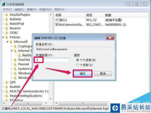 5、在編輯DWORD值窗口,找到數據數值這一項,將其下的值改為“0”,確定,就修改過來了,管理加載項按鈕就可以使用了。