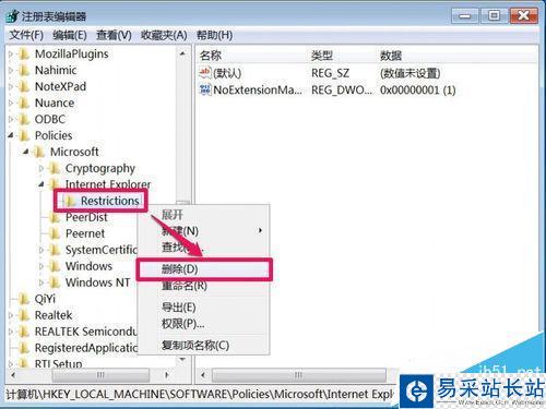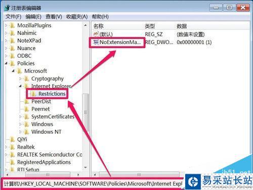 4、然后以HKEY_LOCAL_MACHINE根鍵為頭,依次打開[HKEY_LOCAL_MACHINE/SOFTWARE/Policies/Microsoft/Internet Explorer/Restrictions]此注冊路徑。到右側,找到“NoExtensionManagement”,雙擊。