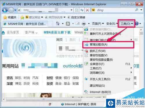 先用一個臨時解決方法,打開IE瀏覽器,在窗口,點擊“工具”菜單,在打開的窗口中,選擇“管理加載項”,同樣可以清理加載項。