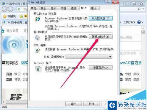 7、注冊表修改好后,再到Internet選項窗口,再看看程序下的“管理加載項”按鈕是否可以使用了,已經從灰色變成可使用的黑色了,修復成功,就可以清理加載項了。