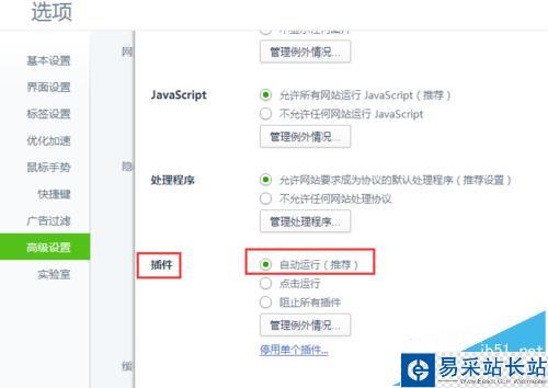 4、繼續找到“插件”,這里我們看到默認是自動運行。