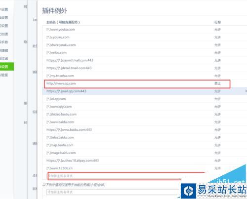7、我們把需要禁止的網站域名添加進入,選擇禁止,即可禁止此網站的自動播放了!這樣其他網站就不會被一起禁止了。