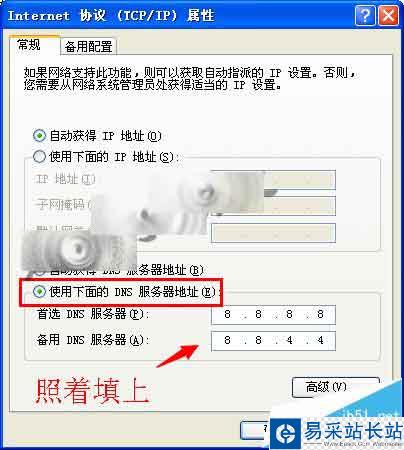 4、勾選【使用下面的DNS服務器地址】,分別填上8.8.8.8和8.8.4.4,保存確定即可。