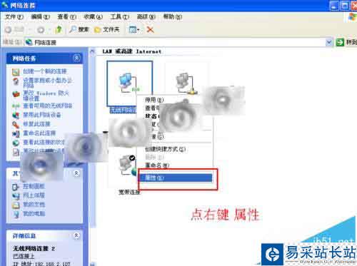2、這里我用的是無線連接,所以在【無線連接】圖標上點擊右鍵,選擇【屬性】。如果是網線連接上網,就在【本地連接】上點右鍵