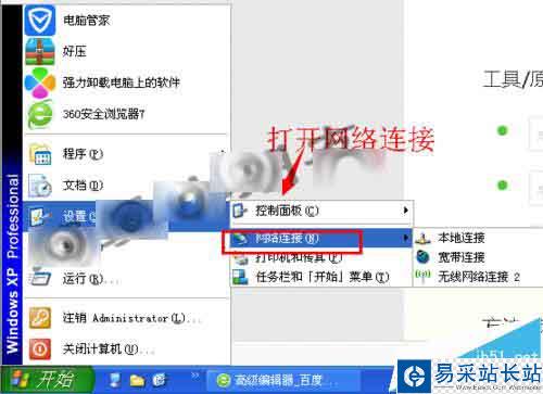 1、以xp系統為例,其他的操作系統原理一樣。點擊【開始】-【設置】-【網絡連接】,打開網絡連接窗口