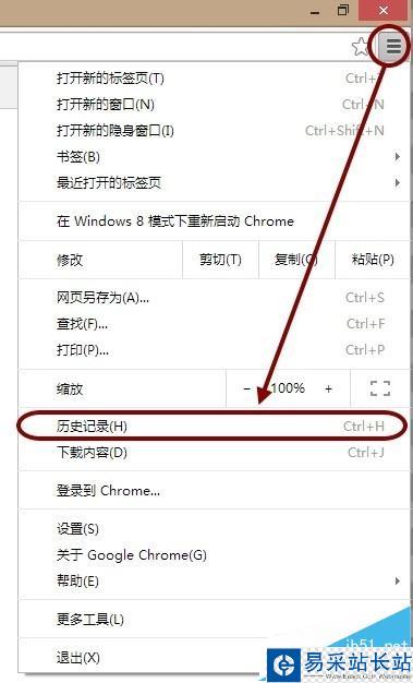 5、除此之外,我們還可以打開Chrome選項中的歷史記錄。或者按下快捷鍵Ctrl+H