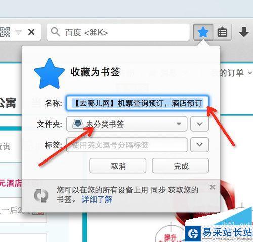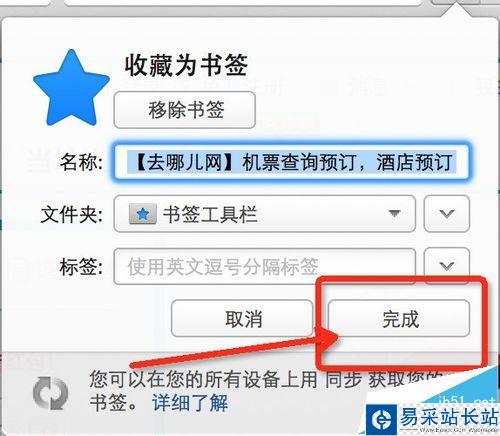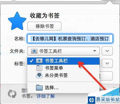 4、看到這里顯示,這個網頁收藏為書簽。名稱改成你自己容易記住的。然后下面的文件夾建議選擇一個方便的。這里小編推薦文件夾選擇“書簽工具欄”,如果這是你經常使用的網站,放在工具欄上是最方便的。