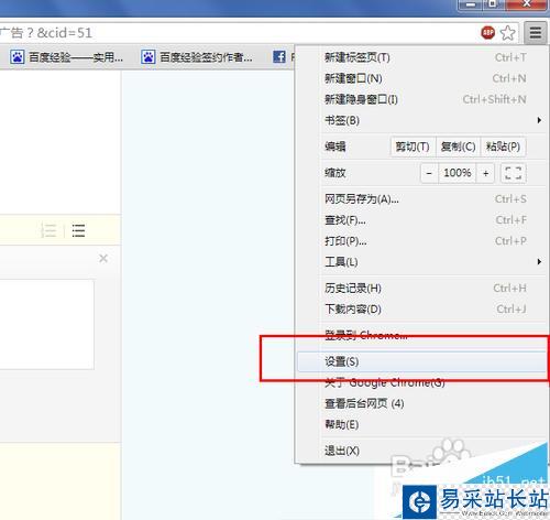 1、首先打開谷歌瀏覽器,然后點擊設置按鈕。谷歌瀏覽器的設置在瀏覽器的右上角上,點擊后選擇設置即可。