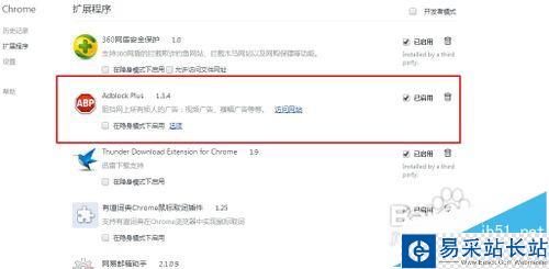 4、將Adblock Plus插件添加到谷歌瀏覽器中即可,添加后查看是否已經(jīng)啟用。不要將其禁止。添加后就會在谷歌瀏覽器的設置界面看到Adblock Plus插件了。